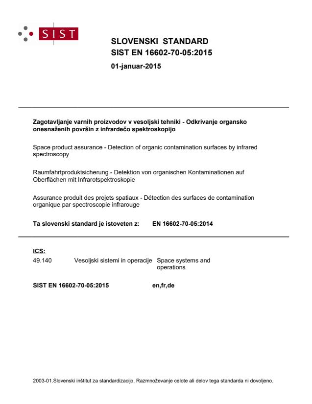 EN 16602-70-05:2014 - "Space product assurance - Detection of organic contamination surfaces by infrared spectroscopy" is a CEN standard that defines test requirements and procedures for detecting organic contamination on surfaces using infrared (IR) spectroscopy. It covers both direct and indirect sampling methods and applies to manned and unmanned spacecraft, launchers, payloads, experiments, terrestrial vacuum test facilities and cleanrooms. The standard supports contamination control as part of space product assurance and may be tailored to project needs in conformance with ECSS-S-ST-00.