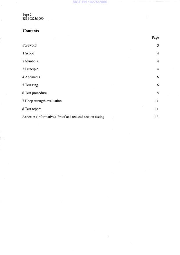 EN 10275:1999 is a standard published by the European Committee for Standardization (CEN). Its full title is "Metallic materials - Tube ring hydraulic pressure test". This standard covers: This European Standard specifies the ring hydraulic pressure test for metallic tubes. It is generally applied to tubes with an outside diameter generally greater than 120 mm and outside diameter to thickness ratio not less than 20. The objective of this test is to ascertain the value of the hoop stress required to produce a specified total circumferential (hoop) strain.
