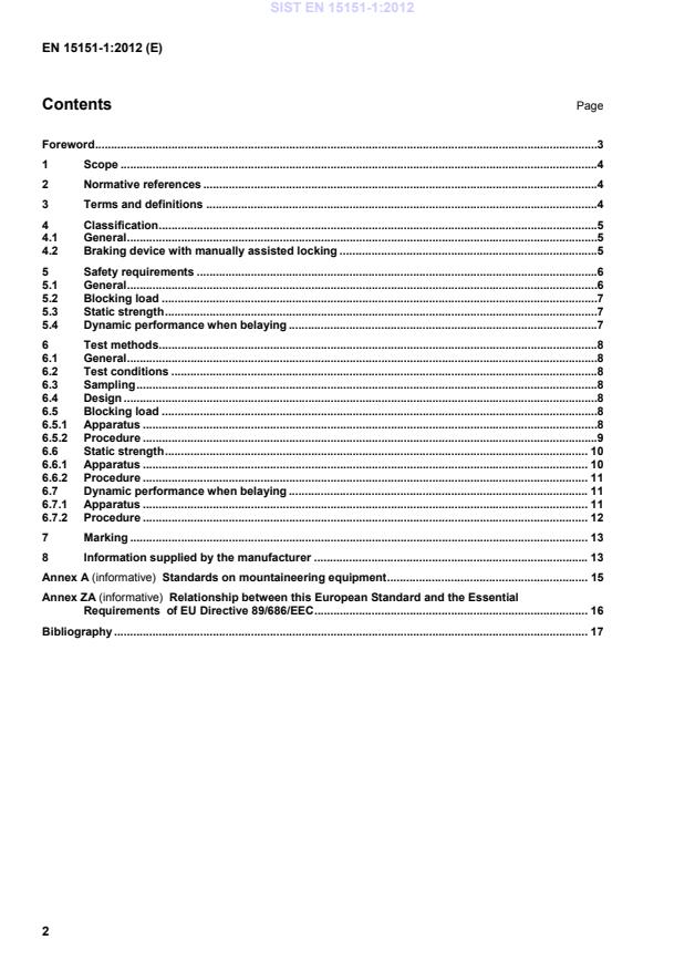 Contents Page Foreword .31 Scope .42 Normative references .43 Terms and definitions .44 Classification .54.1 General .54.2 Braking device with manually assisted locking .55 Safety requirements .65.1 General .65.2 Blocking load .75.3 Static strength .75.4 Dynamic performance when belaying .76 Test methods .86.1 General .86.2 Test conditions .86.3 Sampling .86.4 Design .86.5 Blocking load .86.5.1 Apparatus .86.5.2 Procedure .96.6 Static strength . 106.6.1 Apparatus . 106.6.2 Procedure . 116.7 Dynamic performance when belaying . 116.7.1 Apparatus . 116.7.2 Procedure . 127 Marking . 138 Information supplied by the manufacturer . 13Annex A (informative)