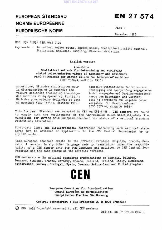 EN 27574-4:1988 is a standard published by the European Committee for Standardization (CEN). Its full title is "Acoustics - Statistical methods for determining and verifying stated noise emission values of machinery and equipment - Part 4: Methods for stated values for batches of machines (ISO 7574-4:1985)". This standard covers: Provides guidelines for determining the labelled value by the labeller and specifies statistical sampling procedures for checking compliance of noise emitted of a lot of machines with its labelled value. Does not deal with the consequences that ensue if the specified value is not confirmed as checked for a lot of machines.