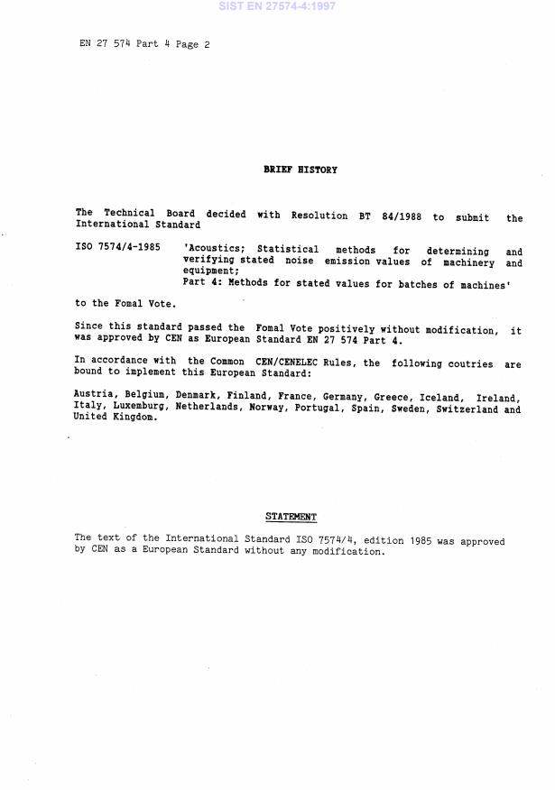 EN 27574-4:1988 (ISO 7574-4:1985) - published by CEN/ISO - defines statistical methods to determine and verify a labelled noise emission value for batches (lots) of machinery and equipment. It gives labellers guidelines to set a stated (labelled) upper noise value and specifies sampling procedures to check whether a lot complies with that value. The standard assumes noise emission values in a batch are approximately normally distributed and requires a specified reference standard deviation for verification. It does not cover the consequences or corrective actions if a lot fails verification.