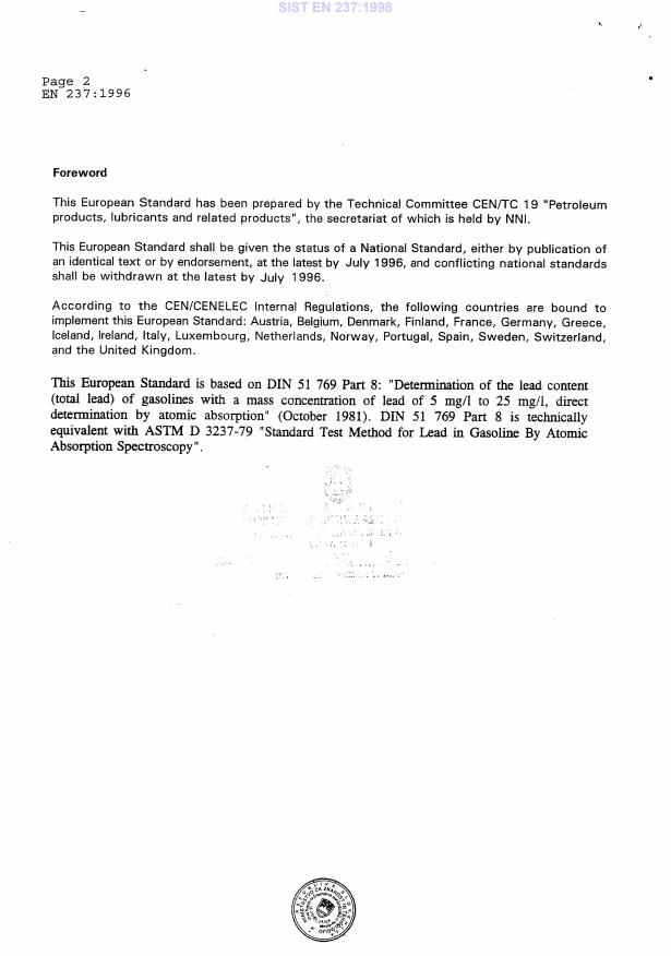 EN 237:1996 is a standard published by the European Committee for Standardization (CEN). Its full title is "Liquid petroleum products - Petrol - Determination of low lead concentrations by atomic absorption spectrometry". This standard covers: This European Standard specifies an atomic absorption spectrometric method for the determination of the total lead content of petrol with a lead content of 5 mg/l to 25 mg/l. This method is independent of the lead alkyl type.
