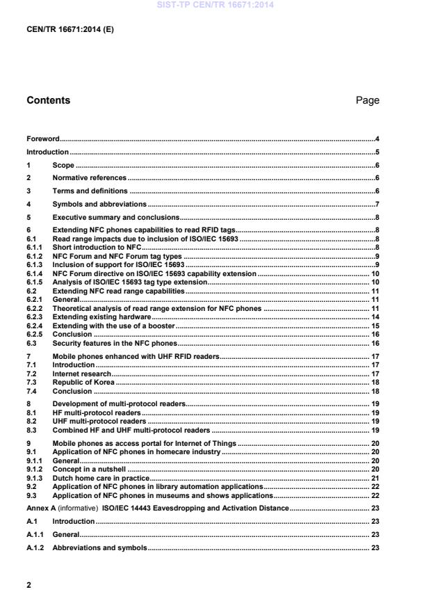 Področje uporabe tega tehničnega poročila je raziskati razvoj na področju uporabe mobilnih telefonov kot RFID-bralnikov. Za referenco uporablja komunikacijske protokole, razvite za komunikacijo kratkega dosega, ki imajo določeno raven varnosti. To tehnično poročilo bo raziskalo znan razvoj na področju uporabe mobilnih telefonov kot RFID-bralnikov, vključno z (a ne omejeno na): - razširitvijo zmožnosti komunikacije kratkega obsega v telefonih na branje oznak RFID, ki so v skladu s standardoma ISO/IEC 15693 in ISO/IEC 18000-3 Način 1; - uporabo mobilnih telefonov kot bralnikov za UHF oznake glede na standard ISO/IEC 18000-6 Tip C; - razvojem večprotokolnih bralnikov, ki lahko preklapljajo med visokimi frekvencami in UHF. Namen tega tehničnega poročila je prepoznati posamezne lastnosti, povezane z mobilnimi telefoni, ki se uporabljajo kot bralniki z oznakami, ki so predvsem namenjene drugi uporabi. Določil bo nekaj morebitnih groženj, ki so povezane s tehnologijo. Prav tako bo razkril vrzeli v postopku standardizacije, ki jih je morda treba obravnavati, da se omili take grožnje. Za uravnavanje kakršnih koli negativnih učinkov tehnično poročilo opredeljuje tudi, kako posamezni državljani in organizacije uporabljajo ali bi lahko uporabljali mobilne telefone, ki se uporabljajo kot RFID-bralniki, kar bi lahko vodilo v povečano prevzemanje RFID in interneta stvari.