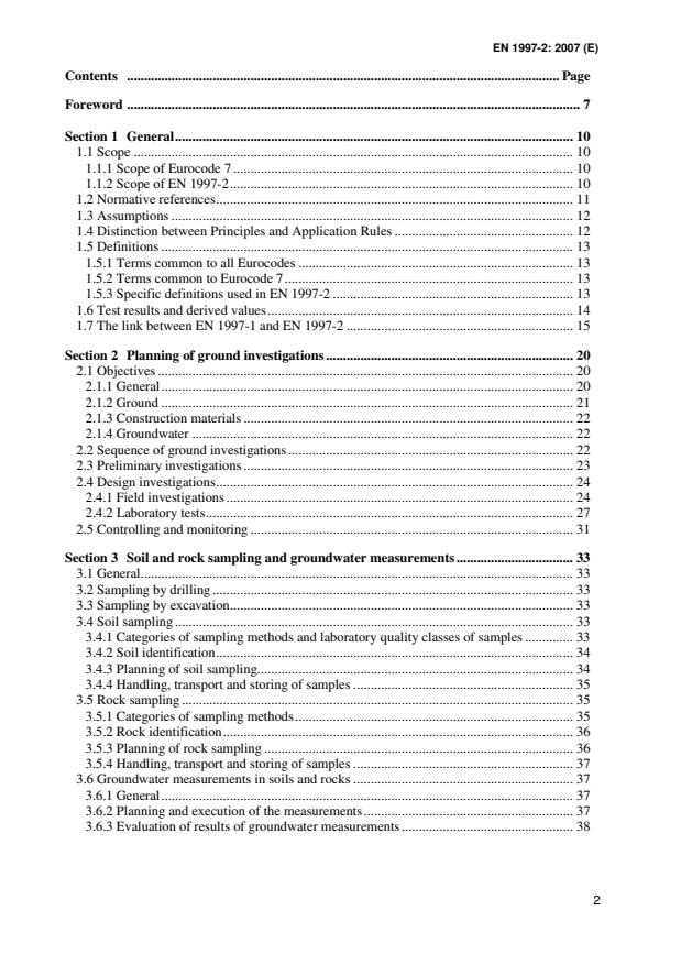 Section 1 General.10 1.1 Scope.10 1.1.1 Scope of Eurocode 7.10 1.1.2 Scope of EN 1997-2.10 1.2 Normative references.11 1.3 Assumptions.12 1.4 Distinction between Principles and Application Rules.12 1.5 Definitions.13 1.5.1 Terms common to all Eurocodes.13 1.5.2 Terms common to Eurocode 7.13 1.5.3 Specific definitions used in EN 1997-2.13 1.6 Test results and derived values.14 1.7 The link between EN 1997-1 and EN 1997-2.15