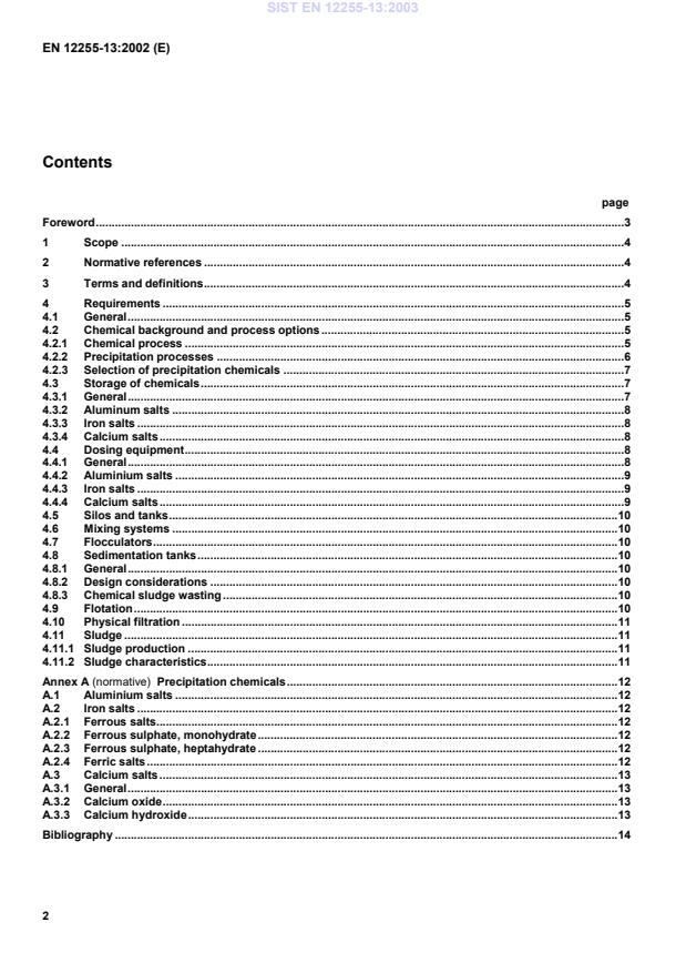 Precipitation chemicals.12A.1Aluminium salts.12A.2Iron salts.12A.2.1Ferrous salts.12A.2.2Ferrous sulphate, monohydrate.12A.2.3Ferrous sulphate, heptahydrate.12A.2.4Ferric salts.12A.3Calcium salts.13A.3.1General.13A.3.2Calcium oxide.13A.3.3Calcium hydroxide.13Bibliography.14SIST EN 12255-13:2003