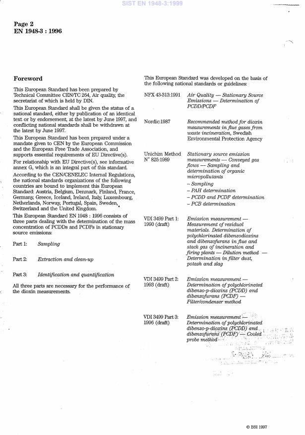 EN 1948-3:1996 is a standard published by the European Committee for Standardization (CEN). Its full title is "Stationary source emissions - Determination of the mass concentration of PCDDs/PCDFs - Part 3: Identification and quantification". This standard covers: The present Part of the Standard specifies the identification and quantificationprocedures of the sampled PCDDs/PCDFs. It is an integral part of the complete measurement procedure. The use of the other two parts of this Standard, EN 1948-1:1996 and EN 1948-2:1996, describing sampling and extraction and clean-up, respectively, is necessary for the determination of the PCDDs/PCDFs. This Stan- dard has been designed to measure PCDD/PCDF concentrations at about 0,1 ng I-TEQ/m cube in stationary source emissions.