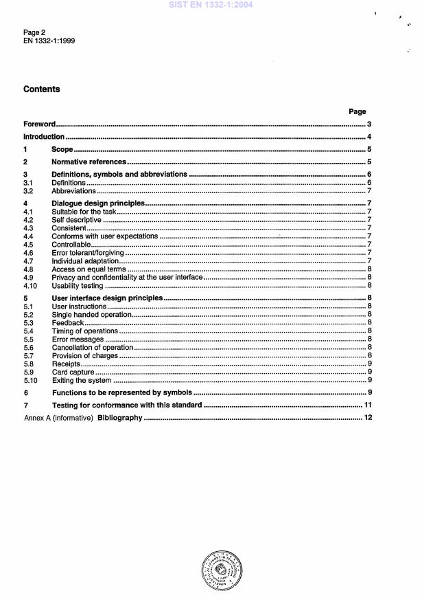 EN 1332-1:1999 is a standard published by the European Committee for Standardization (CEN). Its full title is "Identification card systems - Man-machine interface - Part 1: Design principles for the user interface". This standard covers: This European Standard defines design principles for card based services that are applicable to any sector (eg banking, telecommunications, mass transport, parking, logical access control, physical access control). It also provides recommendations for the operational procedures to be followed when users interact with a card operated device : - in order to enter a system; - whilst using a system; - leaving a system.