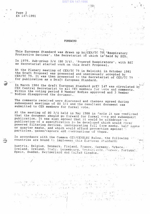 EN 147:1991 is a standard published by the European Committee for Standardization (CEN). Its full title is "Respiratory protective devices - Power assisted particle filtering devices incorporating full face masks, half masks or quarter masks - Requirements, testing, marking". This standard covers: This European Standard specifies minimum requirements for power assisted respiratory protection devices which incorporate a full face mask, half mask or a quarter mask together with a particle filter. It does not cover devices designed for use in circumstances where there is or might be an oxygen deficiency (oxygen less than 17 % by volume). It does not cover respiratory protective devices designed for escape purposes. Laboratory and practical performance tests are included for the assessment of compliance with the requirements.