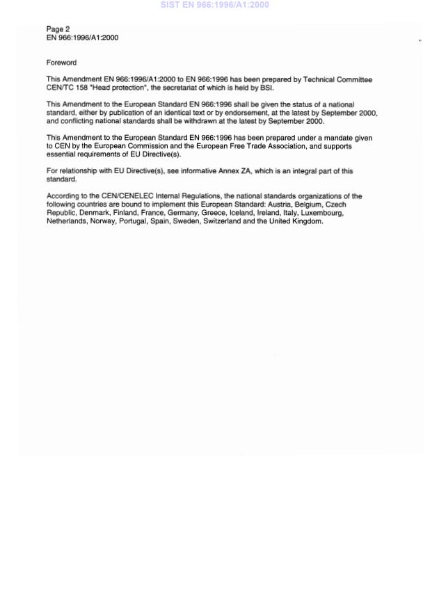 EN 966:1996/A1:2000 is associated with the following European legislation: EU Directives/Regulations: 89/686/EEC, 93/95/EEC, 96/58/EC; Standardization Mandates: M/BC/CEN/90/2. When a standard is cited in the Official Journal of the European Union, products manufactured in conformity with it benefit from a presumption of conformity with the essential requirements of the corresponding EU directive or regulation.