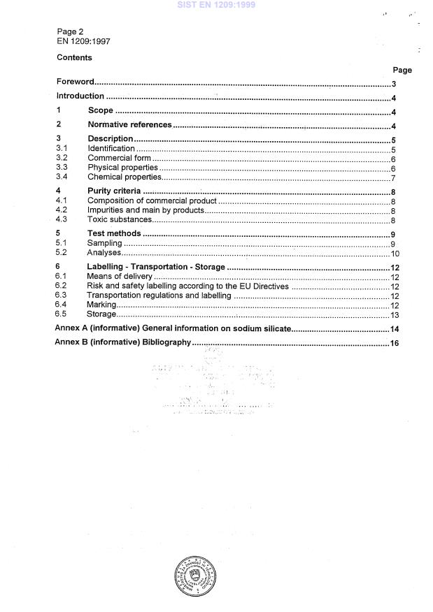EN 1209:1997 is a standard published by the European Committee for Standardization (CEN). Its full title is "Chemicals used for treatment of water intended for human consumption - Sodium silicate". This standard covers: This European Standard describes the characteristics and specifies the requirements and the corresponding test methods for sodium silicate used for treatment of water intended for human consumption. It gives information on its use in water treatment.