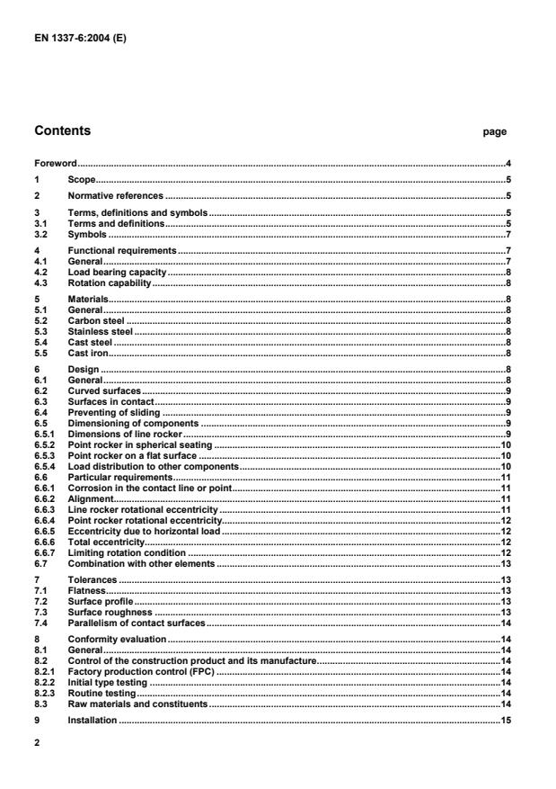 Keywords: EN 1337-6:2004, structural bearings, rocker bearings, line rocker, point rocker, CEN, design requirements, manufacturing, rotation limit 0.05 rad, bearing materials, factory production control.