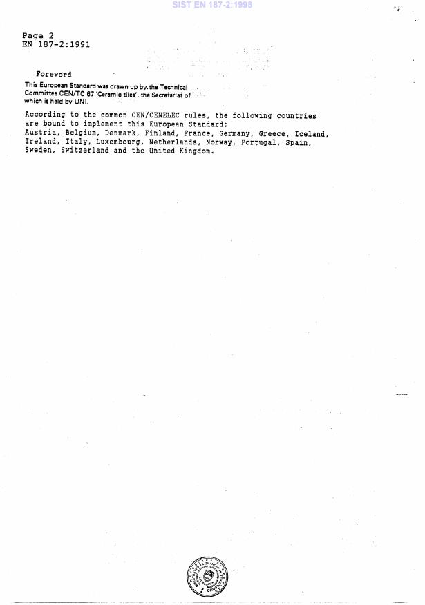 EN 187-2:1991 is a standard published by the European Committee for Standardization (CEN). Its full title is "Ceramic tiles - Extruded ceramic tiles with a water absorption of 6%<E<=10% (Group AIIb) Part 2". This standard covers: This European standard specifies the sizes, dimensional tolerances, mechanical, physical and chemical requirements, surface quality requirements and marking of ceramic tiles. It will make reference to the slip resistance of the tiles as well.
