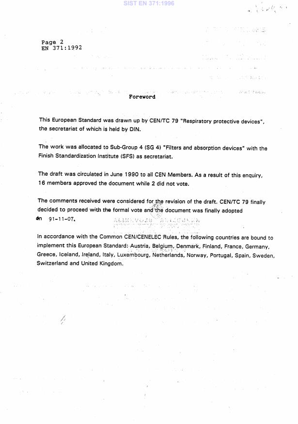 EN 371:1992 is a standard published by the European Committee for Standardization (CEN). Its full title is "Respiratory protective devices - AX gas filters and combined filters against low boiling organic compounds - Requirements, testing, marking". This standard covers: This European Standard refers to gas filters and combined filters against low boiling organic compounds, as specified in [clause] 4, for use as components in unassisted respiratory protective devices, with the exception of escape apparatus and filtering facepieces. It specifies minimum requirements for these filters for use as part of respiratory protective devices. Laboratory and practical performance tests are included for the assessment of compliance with the requirements.