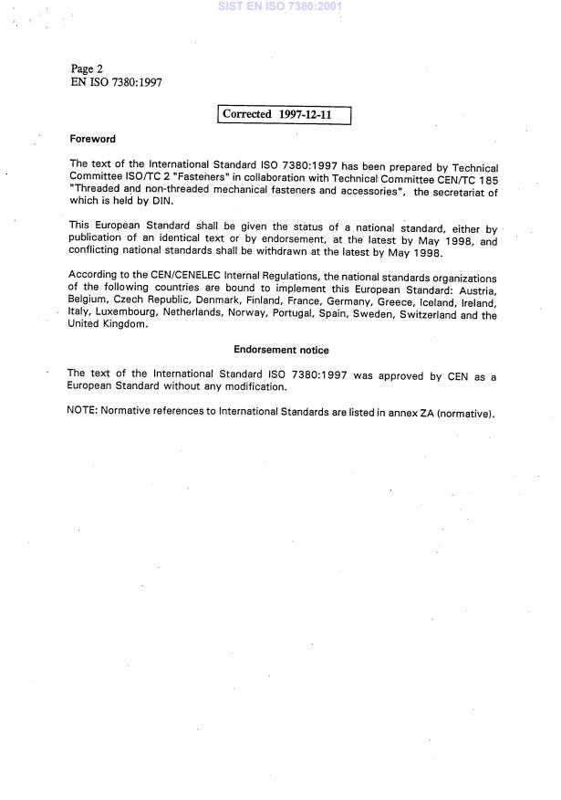 EN ISO 7380:1997 is a standard published by the European Committee for Standardization (CEN). Its full title is "Hexagon socket button head screws (ISO 7380:1997)". This standard covers: Diese Internationale Norm legt die Eigenschaften von metrischen Flachkopfschrauben mit Innensechskant mit Gewinden von M3 bis einschließlich M16 in Produktklasse A und mit Festigkeitsklasse 12.9 fest. Anmerkung: Es wird besonders auf die Fußnote in Tabelle 2 und auf Tabelle 3 bezüglich der Einschränkung der Mindestbruchkraft hingewiesen. Die Lehrung der Innensechskante ist in Anhang A festgelegt.