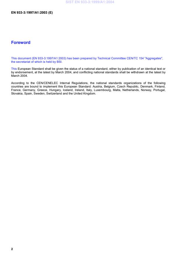 This amendment A1 modifies the European Standard EN 933-3:1997; it was approved by CEN on 1 August 2003.