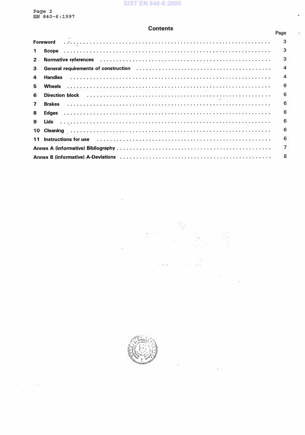 EN 840-6:1997 is a standard published by the European Committee for Standardization (CEN). Its full title is "Mobile waste containers - Part 6: Safety and health requirements". This standard covers: This part 6 of the European Standard provides the most essential safety and health requirements for mobile waste containers, not including hazardous wastes containers.