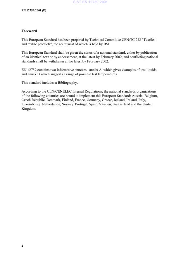 2003-01.Slovenski inštitut za standardizacijo. Razmnoževanje celote ali delov tega standarda ni dovoljeno.Mit Kautschuk oder Kunststoff beschichtete Textilien - Bestimmung der FlüssigkeitsbeständigkeitSupports textiles revetus de caoutchouc ou de plastique - Détermination de la résistance aux liquidesRubber- or plastic-coated fabrics - Determination of resistance to liquids59.080.40WHNVWLOLMHCoated fabricsICS:Ta slovenski standard je istoveten z:EN 12759:2001SIST EN 12759:2001en01-december-2001SIST EN 12759:2001SLOVENSKI