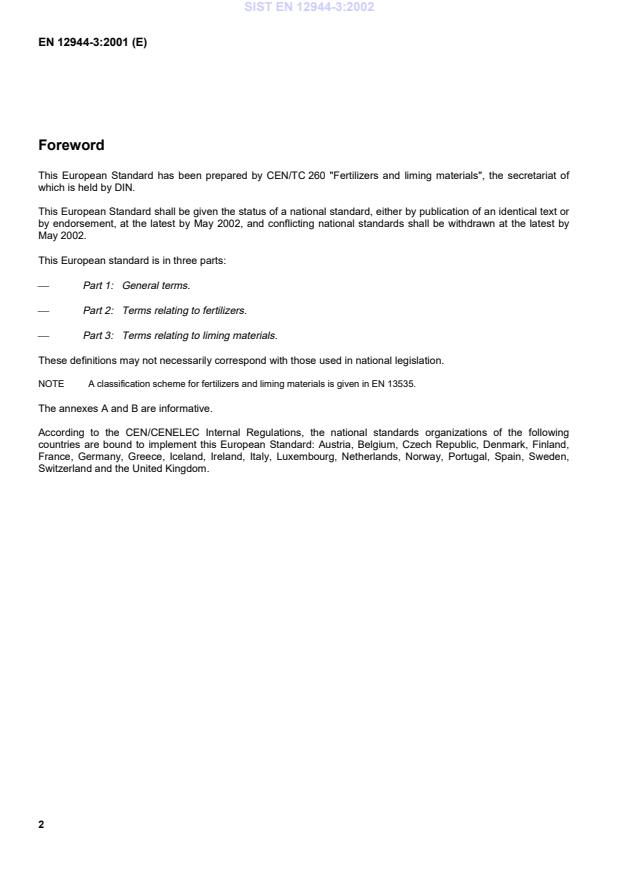 EN 12944-3:2001 is a standard published by the European Committee for Standardization (CEN). Its full title is "Fertilizers and liming materials - Vocabulary - Part 3: Terms relating to liming materials". This standard covers: This European Standard defines terms relating to liming materials. An index of all terms defined in this part of EN 12944, with their French and German equivalents, is given in annex A. A general index of all terms defined in all three parts of EN 12944, with their French and German equivalents, is given in annex B.