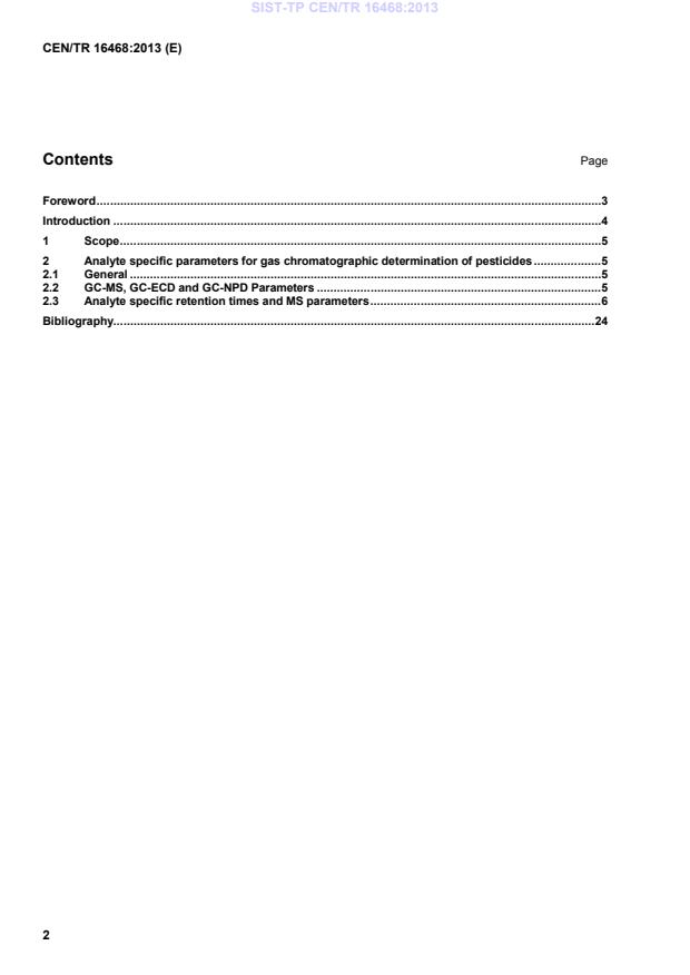 Keywords: CEN/TR 16468:2013, pesticide residues, GC‑MS, retention times, mass spectrometric parameters, SIM, electron impact ionisation, RRT, QuEChERS, EN 1528, EN 12393, EN 15662.