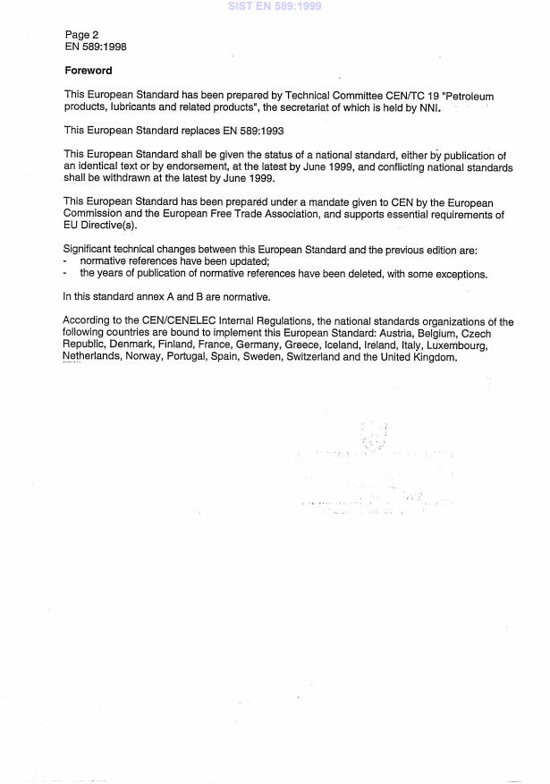 EN 589:1998 is a standard published by the European Committee for Standardization (CEN). Its full title is "Automotive fuels - LPG - Requirements and test methods". This standard covers: This European Standard specifies requirements and test methods for marketed and delivered automotive LPG (Liquefied Petroleum Gases). It is applicable to automotive LPG for use in vehicles fit to run on automotive LPG.