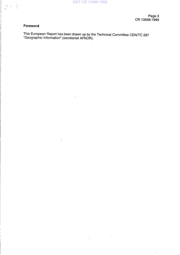 CR 13568:1999 is a standard published by the European Committee for Standardization (CEN). Its full title is "Geographic information - Data description - Conceptual schema language". This standard covers: To develop or adopt formal languages and graphical notations for defining and describing application data - including geometry directory and dictionary data. This includes the definitions of techniques for mapping from conceptual schemas to transfer schemas.