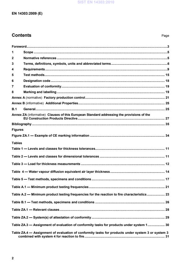 4 — Water vapour diffusion equivalent air layer thickness . 14Table 5 — Test methods, specimens and conditions . 17Table A.1 — Minimum product testing frequencies . 21Table A.2 — Minimum product testing frequencies for the reaction to fire characteristics . 23Table B.1 — Test methods, specimens and conditions . 26Table ZA.1 — Relevant clauses . 28Table ZA.2 — System(s) of attestation of conformity . 29Table ZA.3 — Assignment of evaluation of conformity tasks for products under system 1 . 30Table ZA.4 — Assignment of evaluation of conformity tasks for products under system 3 or system 3 combined with system 4 for reaction to fire . 31 SIST EN 14303:2010