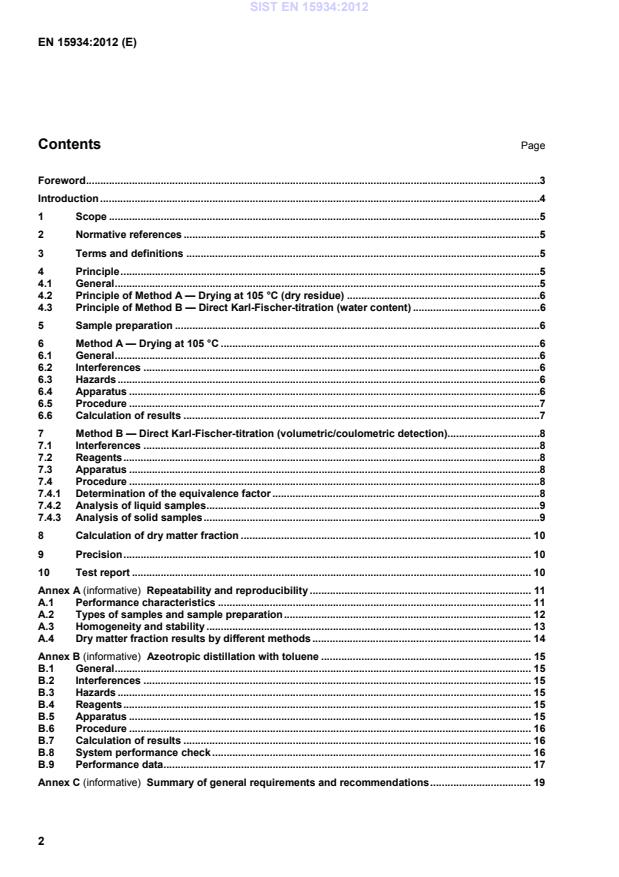 Azeotropic distillation with toluene . 15B.1 General . 15B.2 Interferences . 15B.3 Hazards . 15B.4 Reagents . 15B.5 Apparatus . 15B.6 Procedure . 16B.7 Calculation of results . 16B.8 System performance check . 16B.9 Performance data. 17Annex C (informative)