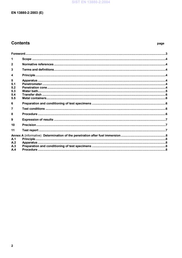 Determination of the penetration after fuel immersion.8A.1Principle.8A.2Apparatus.8A.3Preparation and conditioning of test specimens.8A.4Procedure.8SIST EN 13880-2:2004