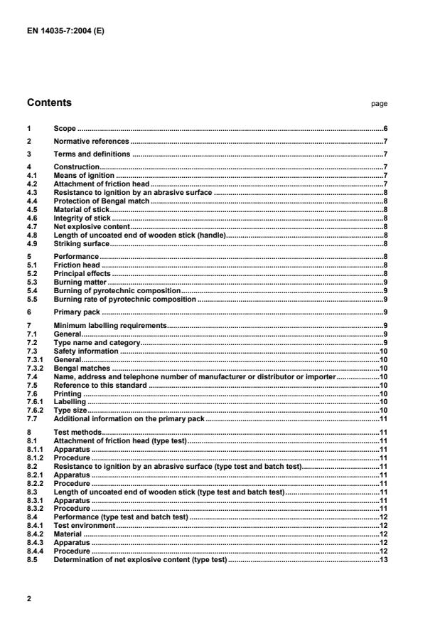 1 Scope This document specifies requirements for the construction, performance, primary packaging and labelling of Bengal matches and the corresponding test methods. It is applicable to fireworks which are classified as Bengal match in category 1 in EN 14035-2 and which are contained in a primary pack. It is not applicable to Bengal matches containing pyrotechnic composition that includes any of the following substances: — arsenic or arsenic compounds; — mixtures containing a mass fraction of chlorates greater than 80 %; — mixtures of chlorates with metals; — mixtures of chlorates with red phosphorus; — mixtures of chlorates with potassium hexacyanoferrate(II); — mixtures of chlorates with sulfur; — mixtures of chlorates with sulfides; — lead or lead compounds; — mercury compounds; — white phosphorus; — picrates or picric acid; — potassium chlorate with a mass fraction of bromates greater than 0,15 %; — sulfur with an acidity, expressed in mass fraction of sulphuric acid, greater than 0,002 %; — zirconium with a particle size of less than 40 µm. NOTE In EN 14035-2, Bengal matches are classified as follows: — brief description: short wooden stick partially coated (along one end) with slow-burning pyrotechnic composition, with a dot of friction-sensitive pyrotechnic composition at the tip, and designed to be hold in the hand; — principal effects: emission of coloured flame and/or sparks. Schemes for type testing of Bengal matches and batch testing of Bengal matches are specified in annex A and annex B respectively.