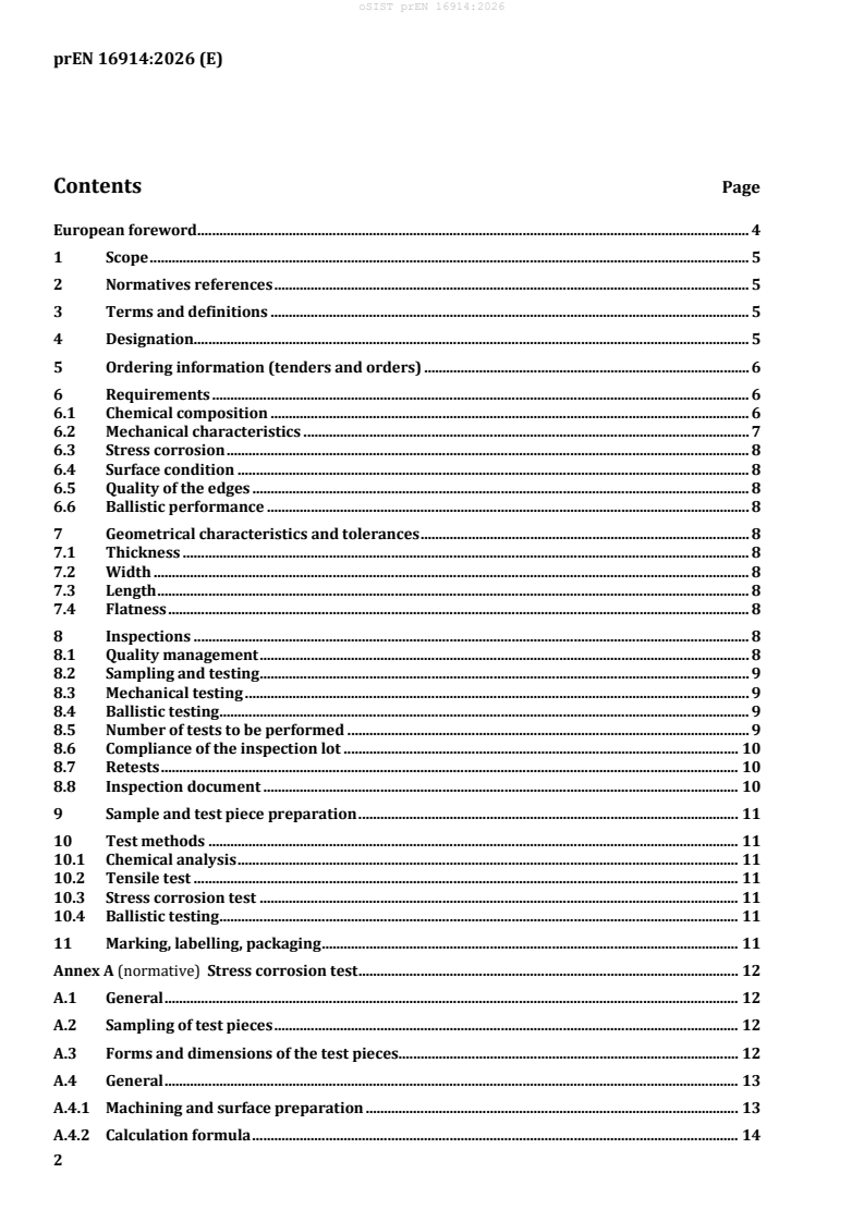 prEN 16914 is a draft European standard developed by CEN/TC 132 that specifies the technical delivery conditions for hot-rolled armour plates produced from weldable aluminium alloys. These aluminium armour plates are intended for ballistic protection applications and are available in two categories - ARAL1 (10 mm to 70 mm thick) and ARAL2 (10 mm to 80 mm thick). The document covers requirements such as chemical composition, mechanical properties, testing procedures, inspection, marking, and quality assurance for both material categories.