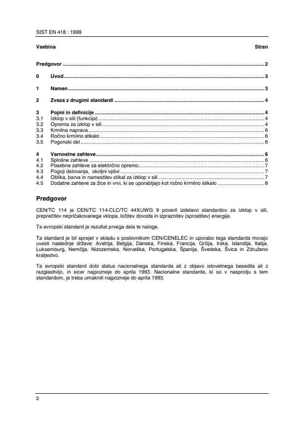 Standard SIST EN 418, Varnost strojev - Oprema za izklop v sili - Funkcionalni vidiki, načela