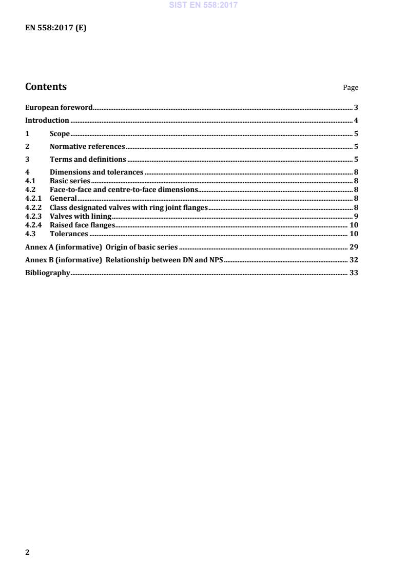 EN 558:2017 is a standard published by the European Committee for Standardization (CEN). Its full title is "Industrial valves - Face-to-face and centre-to-face dimensions of metal valves for use in flanged pipe systems - PN and Class designated valves". This standard covers: This European Standard specifies the "face-to-face" (FTF) and "centre-to-face" (CTF) dimensions for PN and Class designated metal valves used in flanged pipe systems. This European Standard covers valves with the following PN, Class and DN values: - PN 2,5; PN 6; PN 10; PN 16; PN 25; PN 40; PN 63; PN 100; PN 160; PN 250; PN 320; PN 400; - Class 125; Class 150; Class 250; Class 300; Class 600; Class 900; Class 1 500; Class 2 500; - DN 10; DN 15; DN 20; DN 25; DN 32; DN 40; DN 50; DN 65; DN 80; DN 100; DN 125; DN 150; DN 200; DN 250; DN 300; DN 350; DN 400; DN 450; DN 500; DN 600; DN 700; DN 750; DN 800; DN 900; DN 1 000; DN 1050; DN 1 200; DN 1 400; DN 1 600; DN 1 800; DN 2 000. For valves in other shell materials than metal the same FTF and CTF dimensions may be used. For relationship between DN and NPS see Annex B.