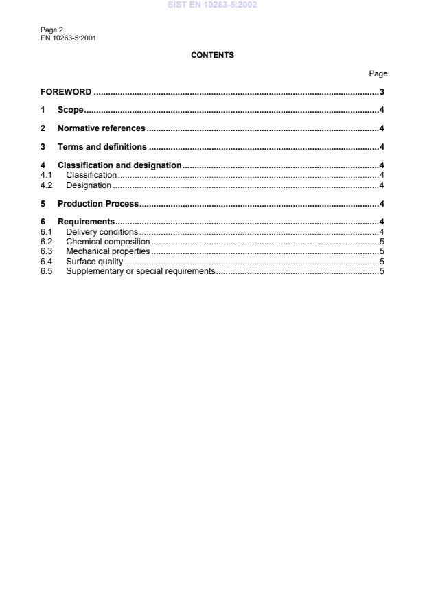 Page 2EN 10263-5:2001CONTENTSPageFOREWORD.31Scope.42Normative references.43Terms and definitions.44Classification and designation.44.1Classification.44.2Designation.45Production Process.46Requirements.46.1Delivery conditions.46.2Chemical composition.56.3Mechanical properties.56.4Surface quality.56.5Supplementary or special requirements.5SIST EN 10263-5:2002