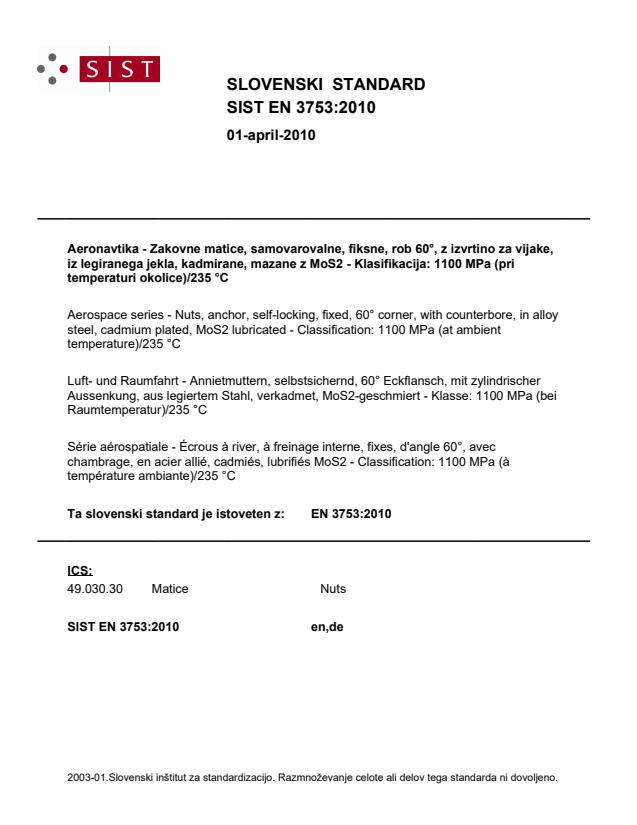 2003-01.Slovenski inštitut za standardizacijo. Razmnoževanje celote ali delov tega standarda ni dovoljeno.Aeronavtika - Zakovne matice, samovarovalne, fiksne, rob 60°, z izvrtino za vijake, iz legiranega jekla, kadmirane, mazane z MoS2 - Klasifikacija: 1100 MPa (pri temperaturi okolice)/235 °CLuft- und Raumfahrt - Annietmuttern, selbstsichernd, 60° Eckflansch, mit zylindrischer Aussenkung, aus legiertem Stahl, verkadmet, MoS2-geschmiert - Klasse: 1100 MPa (bei Raumtemperatur)/235 °CSérie aérospatiale - Écrous à river, à freinage interne, fixes, d'angle 60°, avec chambrage, en acier allié, cadmiés, lubrifiés MoS2 - Classification: 1100 MPa (à température ambiante)/235 °CAerospace series - Nuts, anchor, self-locking, fixed, 60° corner, with counterbore, in alloy steel, cadmium plated, MoS2 lubricated - Classification: 1100 MPa (at ambient temperature)/235 °C49.030.30MaticeNutsICS:Ta slovenski standard je istoveten z:EN 3753:2010SIST EN 3753:2010en,de01-april-2010SIST EN 3753:2010SLOVENSKI