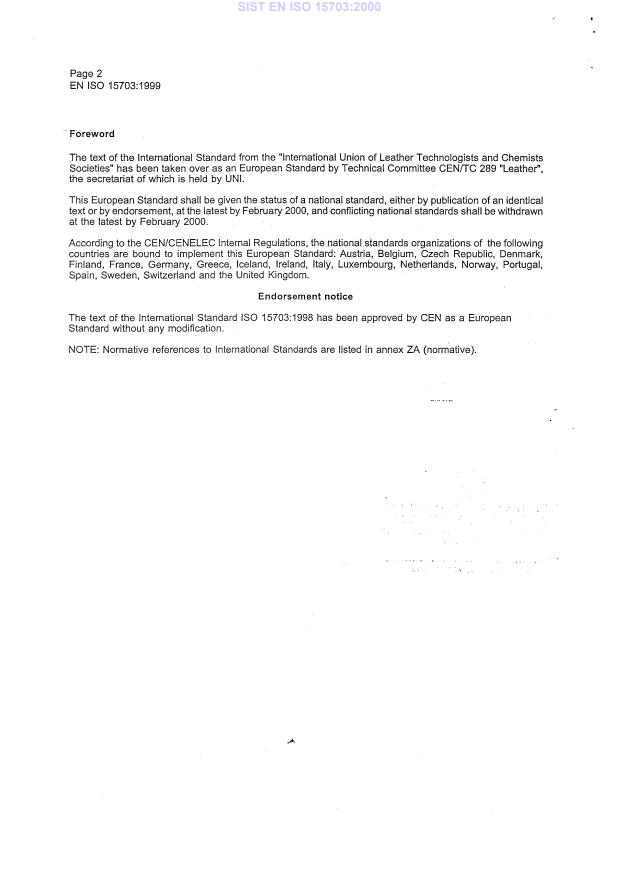 EN ISO 15703:1999 is a standard published by the European Committee for Standardization (CEN). Its full title is "Leather - Tests for colour fastness - Colour fastness to mild washing (ISO 15703:1998)". This standard covers: Migrated from Progress Sheet (TC Comment) (2000-07-10): WIs 056 to 060 are the result of the splitting of WI 021 (TC Res 10/1996)