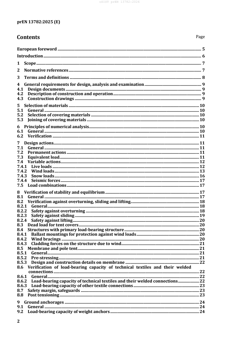 prEN 13782 covers detailed requirements for design documentation, construction drawings, and methods of structural analysis. It mandates careful selection and verification of materials and components, including technical textiles and their connections.Load Calculations