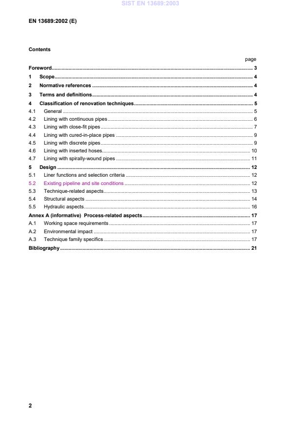 EN 13689:2002 is a standard published by the European Committee for Standardization (CEN). Its full title is "Guidance on the classification and design of plastics piping systems used for renovation". This standard covers: This standard defines families of techniques for renovation of non-pressure and pressure pipelines by use of plastics pipes, fittings and their ancillary components.It provides guidance on the design of plastics piping systems applied as linings to existing pipelines, covering: - lining functions; - existing pipeline and site conditions; - Technique related aspects; - structural aspects; - hydraulic aspects.