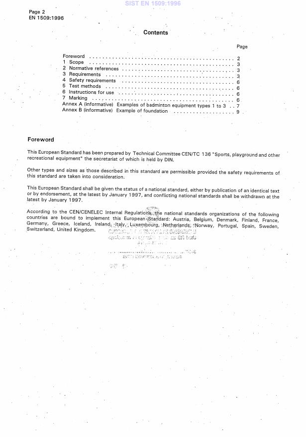 EN 1509:1996 is a standard published by the European Committee for Standardization (CEN). Its full title is "Playing field equipment - Badminton equipment - Functional and safety requirements, test methods". This standard covers: This European Standard specifies the functional requirements and the safety requirements for badminton equipment, excluding rackets and shuttlecocks. This standard is applicable to three types of badminton equipment which are used indoors.