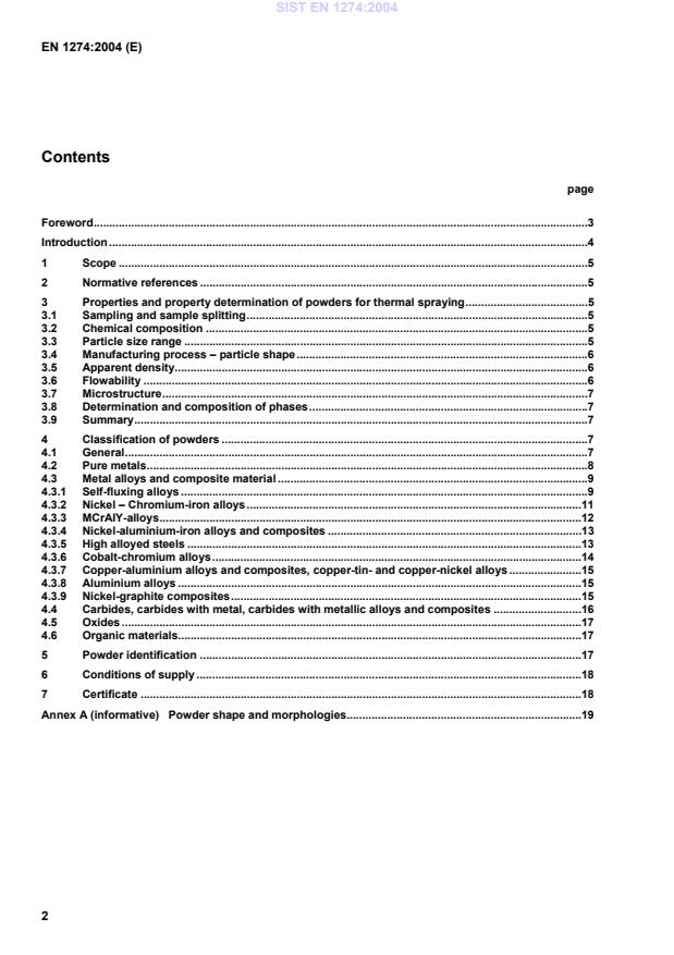 Introduction The document has been aimed to designate the most important thermal spray-coating powders on the basis of their composition, their manufacturing process and their particle size distribution. The majority of commercially available powders is covered by and can be characterised and specified according to this document. The document is meant to simplify understanding of the great product variety on the market for the manufacturer and user, and nevertheless offer a vast choice. Due to the number of the spray powders referred to in this document, in some cases abbreviations are used. Exception is granted to details on the properties of sprayed coatings. Such properties resulting from spraying conditions not covered by this document, e.g. gas composition, deposition efficiency, material flow rate, stand off distance, etc., can differ greatly from the properties of the original powder. Applications of powders for thermal spraying have been explicitly described in the relevant literature; therefore, a separate outline in this place is not necessary. SIST EN 1274:2004
