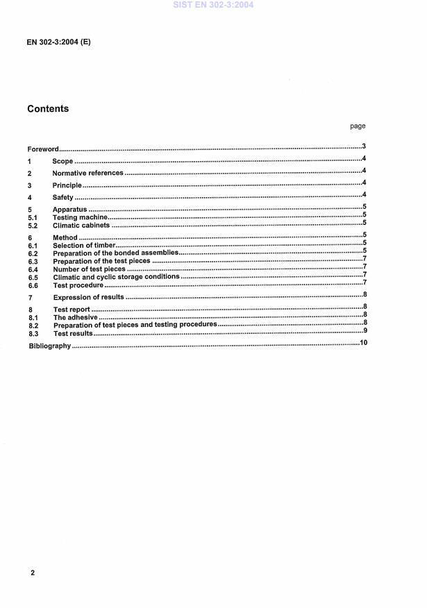 EN 302-3:2004 is a standard published by the European Committee for Standardization (CEN). Its full title is "Adhesives for load-bearing timber structures - Test methods - Part 3: Determination of the effect of acid damage to wood fibres by temperature and humidity cycling on the transverse tensile strength". This standard covers: This Part of EN 302 specifies a method for determining the effect on bond strength of damage to wood fibres caused by the action of acids from the adhesive during climatic cycling. It is suitable for the following applications: a) assessing the compliance of adhesives with EN 301; b) for assessing the suitability and quality of adhesives for load-bearing timber structures; c) for determining if the adhesive after bonding has a damaging influence on the strength of the wood due to chemical action. This test is intended primarily to obtain performance data for the classification of adhesives for load-bearing timber structures according to their suitability for use in defined climatic environments. This test is carried out on spruce (Picea abies L.). This method is intended for use to provide numerical design data and does not necessarily represent the performance of the bonded member in service. It is not intended to be used to assess the suitability of adhesives for the manufacture of wood-based panels. NOTE Attention is drawn to the fact that the performance requirement established in EN 301 for the acid fibre damage test applies only if either: 1) the adhesive mixture, or 2) one of the adhesive components, when applied separately, shows a pH value lower than 4,0, as determined by EN 1245.