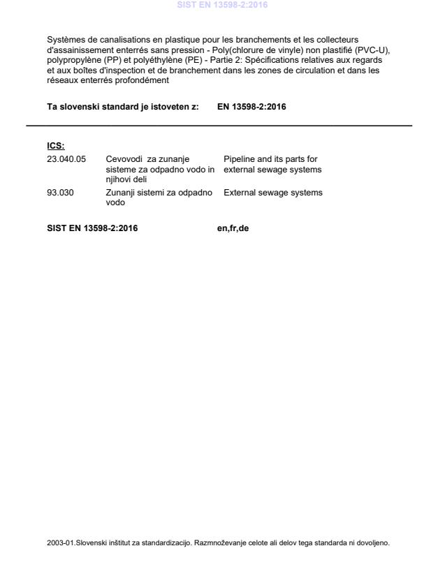 2003-01.Slovenski inštitut za standardizacijo. Razmnoževanje celote ali delov tega standarda ni dovoljeno.MDãNHKunststoff-Rohrleitungssysteme für erdverlegte drucklose Abwasserkanäle und -leitungen - Weichmacherfreies Polyvinylchlorid (PVC-U), Polypropylen (PP) und Polyethylen (PE) - Teil 2: Anforderungen an Einsteigschächte und Kontrollschächte für Verkehrsflächen und tiefe ErdverlegungPlastics piping systems for non-pressure underground drainage and sewerage - Unplasticized poly(vinyl chloride) (PVC-U), polypropylene (PP) and polyethylene (PE) - Part 2: Specifications for manholes and inspection chambers01-september-2016SIST EN 13598-2:2016SLOVENSKI