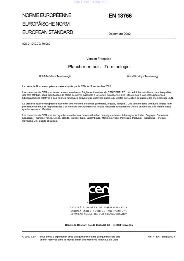 EN 13756:2002 is a standard published by the European Committee for Standardization (CEN). Its full title is "Wood flooring - Terminology". This standard covers: This European Standard contains terms and their definitions relating to wood flooring.