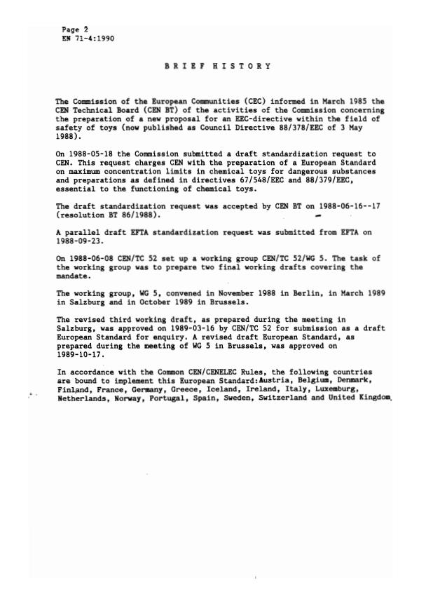 EN 71-4:1990 is a standard published by the European Committee for Standardization (CEN). Its full title is "Safety of toys - Part 4: Experimental sets for chemistry and related activities". This standard covers: See Part 1 of this European Standard. This part includes requirements for: - the maximum amounts of substances and preparations classified as dangerous within the definitions contained in Directives 67/548/EEC (with subsequent amendments and adaptations) and 88/379/EEC (with subsequent amendments and adaptations); and - the maximum amounts of substances and preparations which in excessive amounts may harm the health of the children using them and which are not covered by the above mentioned Directives; and - the maximum amounts of any other chemical substances delivered with the toy.