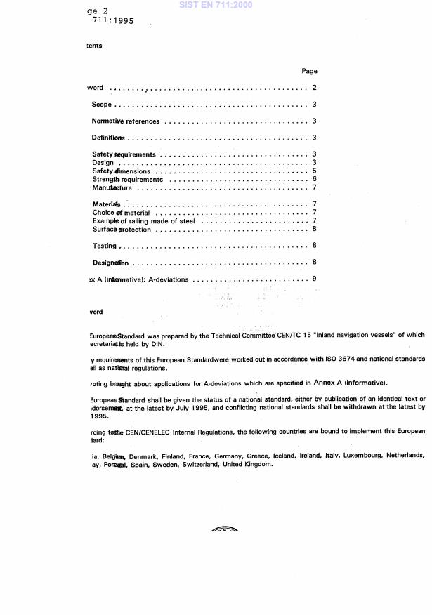 EN 711:1995 is a standard published by the European Committee for Standardization (CEN). Its full title is "Inland navigation vessels - Railings for decks - Requirements, types". This standard covers: This Standard is applicable to railings for decks on inland navigation vessels. It lays down design, dimensions, strength and test conditions which have to be observed for safety reasons. These railings provide protection for persons against falling overboard and from one deck to another.