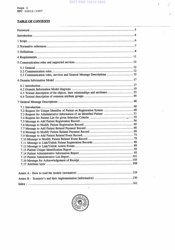 ENV 12612:1997 is a standardization document published by the European Committee for Standardization (CEN). Its full title is "Medical informatics - Messages for the exchange of healthcare administrative information". This standard covers: 1.1 This European Prestandard specifies general administrative messages for electronic information exchange between healthcare information systems. 1.2 The messages defined in this European Prestandard provide for an identification framwork for both administrative and non-administrative purposes.1.3 The messages identified in this European Prestandard pay especial attention to identification of both the individual and records pertaining to them and the registration of the individual on healthcare information systems.