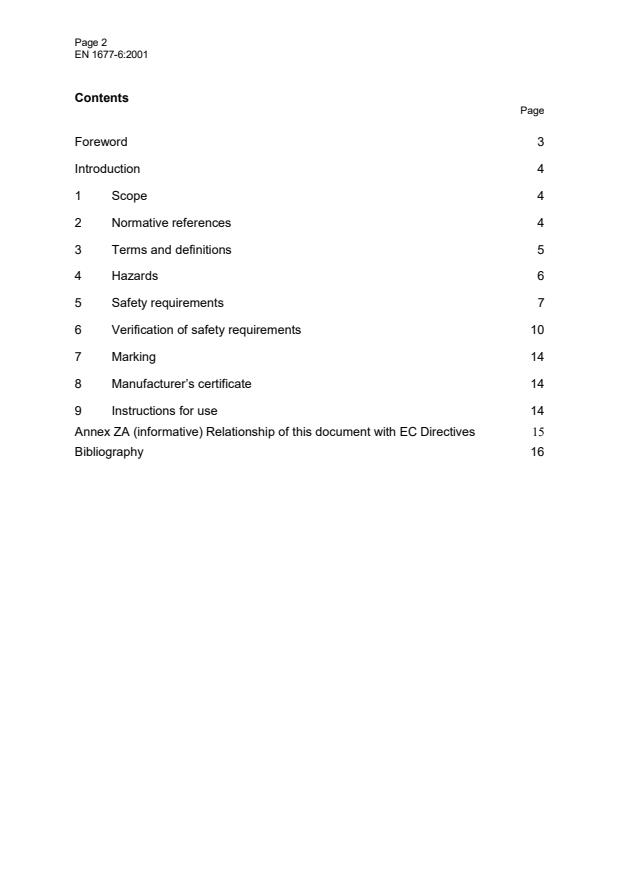 EN 1677-6:2001 is associated with the following European legislation: EU Directives/Regulations: 98/37/EC; Standardization Mandates: M/BC/CEN/91/1. When a standard is cited in the Official Journal of the European Union, products manufactured in conformity with it benefit from a presumption of conformity with the essential requirements of the corresponding EU directive or regulation.