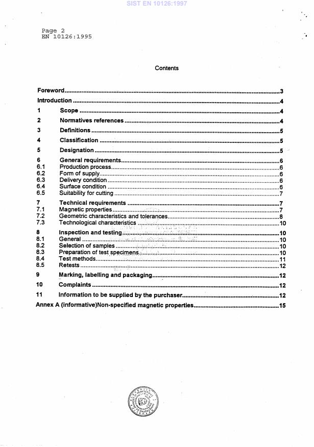 EN 10126:1995 is a standard published by the European Committee for Standardization (CEN). Its full title is "Cold rolled electrical non-alloyed steel sheet and strip delivered in the semi-processed state". This standard covers: This European Standard defines the grades of cold-rolled electrical non-orientednon-alloyed steel sheet and strip delivered in the semi-processed condition, that is without final heat treatment of 0,50mm and 0,65mm nominal thickness. It specifies general requirements, the magnetic properties, the geometric characteristics and tolerances, technological characteristics as well as the inspection procedure. This European Standard applies to material intended for the construction of magnetic circuits. These magnetic materials corresponds to Clause B2 of IEC 404-1.