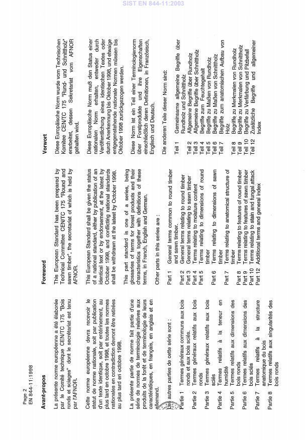 EN 844-11:1998 is a standard published by the European Committee for Standardization (CEN). Its full title is "Round and sawn timber - Terminology - Part 11: Terms relating to degrade by insects". This standard covers: This part of this standard defines terms relating to degrade by insects used in European Standards. The definitions in this part standard are for general commercial use. NOTE: In case of dispute, attention is drawn to the definitions given in standards prepared by CEN/TC 38 "Durability of wood and derived materials".