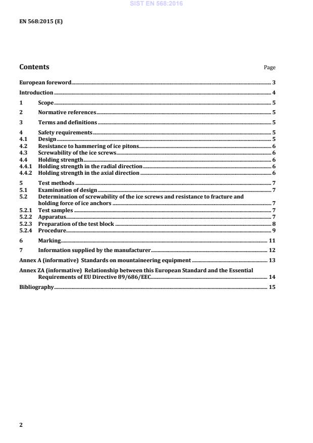 a) b) Figure 2 — Attachment point eye dimensions 4.1.3 When tested according to 5.1, the eye shall have an internal diameter of at least 15 mm. See b) in Figure 2. 4.2 Resistance to hammering of ice pitons When tested in accordance with 5.2.4.1, ice pitons shall not show any deformation likely to affect safety, e.g. cracks or separation of components. The impact area of the head shall remain sufficiently intact so as to allow further hammering. NOTE Deformation due to hammering, as occurs with chisels, is not considered detrimental. If the ice anchor has a sling for attachment, which is removable without tools, the sling shall conform to EN 566. 4.3 Screwability of the ice screws When tested in accordance with 5.2.4.2 after a maximum of 10 full rotations of the ice screw the penetration of the following rotation shall be equal to the pitch of the thread of the ice screw. 4.4 Holding strength 4.4.1 Holding strength in the radial direction When tested in accordance with 5.2.4.3.1, anchors shall withstand a force of at least 10 kN in the radial direction, without being pulled out of the ice or breaking. Permanent deformation during the test is permitted. 4.4.2 Holding strength in the axial direction When tested in the axial direction in accordance with 5.2.4.3.2, ice anchors shall withstand a force of at least 5 kN without the hanger breaking or becoming detached. All test samples shall meet the requirement. SIST EN 568:2016