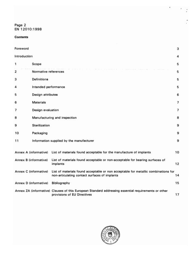 EN 12010:1998 is a standard published by the European Committee for Standardization (CEN). Its full title is "Non-active surgical implants - Joint replacement implants - Particular requirements". This standard covers: This European Standard specifies particular requirements for total and partial joint replacement implants, artificial ligaments and bone cement, hereafter referred to as implants. For the purposes of this standard, artificial ligaments and their associated fixing devices are included in the term implant, hereinafter referred to as implants. It specifies requirements for intended performance, design attributes, materials, design evaluation, manufacturing, sterilization, packaging and information to be supplied by the manufacturer. Some tests required to demonstrate compliance with this standard are contained in or referenced in level 3 standards.
